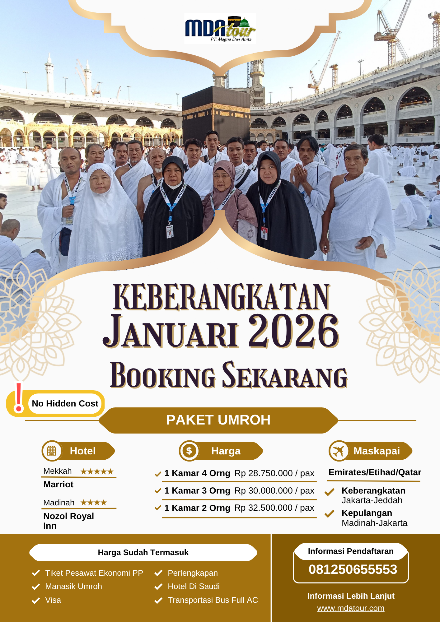 Jelajahi ruang spiritual dalam jiwa Anda dengan mempercayakan kepada MDA Tour membantu menuju Ka'bah, Rumah Ibadah Pertama dan Tertua di muka bumi, di kota Mekkah Al Mukarromah dan melepas kerinduan kepada Nabi Muhammad SAW, dengan suguhan suasana khusu' dalam taman surga dunia "Raudoh" di Masjid Nabawi kota Madinah Al Munawaroh.